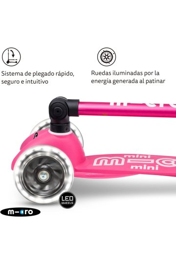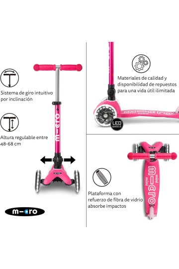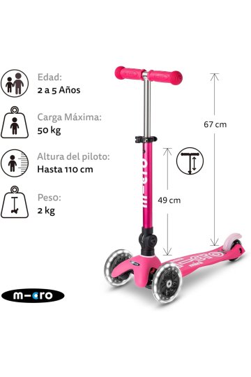 O Mini Micro foi eleito o Brinquedo do Ano várias vezes pelos pais. Este brinquedo esportivo não apenas incentiva o movimento e o exercício, mas também ajuda as crianças a melhorar o equilíbrio, a coordenação e as habilidades motoras finas. O guidão projetado em forma de T torna a condução mais segura e possui uma trava de segurança que significa que apenas adultos podem removê-lo para armazenamento. Possui um sistema patenteado de inclinação e rotação. A plataforma é feita de fibra de vidro, o que lhe confere resistência e flexibilidade. Também inclui letras de borracha em relevo que são antiderrapantes, facilitando o manuseio da scooter e dando segurança extra aos nossos pequenos. Por último, mas não menos importante, estão as inovadoras rodas de LED. Estes funcionam através de um dínamo, por isso não requerem baterias, mas só funcionam quando nos movemos. Eles emitem uma luz branca brilhante que, além de ser divertida para nossos pequenos, dá segurança ao serem vistos com mais facilidade em tempos de escuridão.